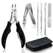 Everything you need to perform proper toenail care in kit. This kit comes with a sharp pointed nail nipper (specially for hard, overgrown or ingrown toenails), 2-piece ingrown toenail tool set, standard toenail clipper, cuticle pusher and nailfile, all made of stainless steel and packed in a black storage case.